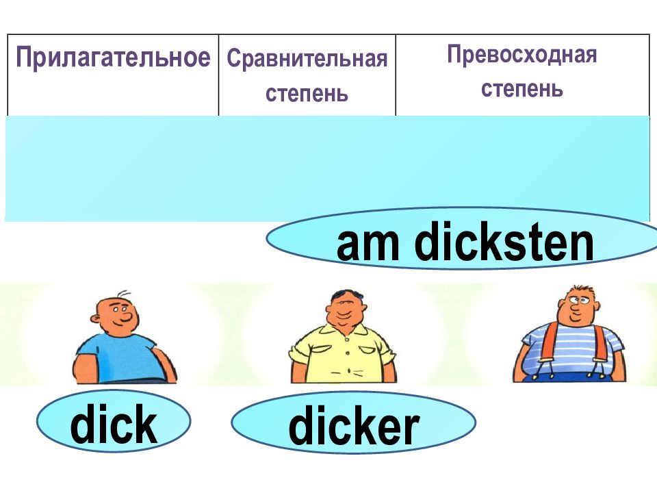 Прилагательное Сравнительная степень Превосходная степень 1. klein er klein er am sten am klein sten 2. a, o, u w a rm (1 слог) ä, ö, ü w ä rm er ä, ö, ü am w ä rm sten 3. –t, -d, -ss, -z k a l t er k ä lt er am e sten am k ä lt e sten dick dicker am dicksten