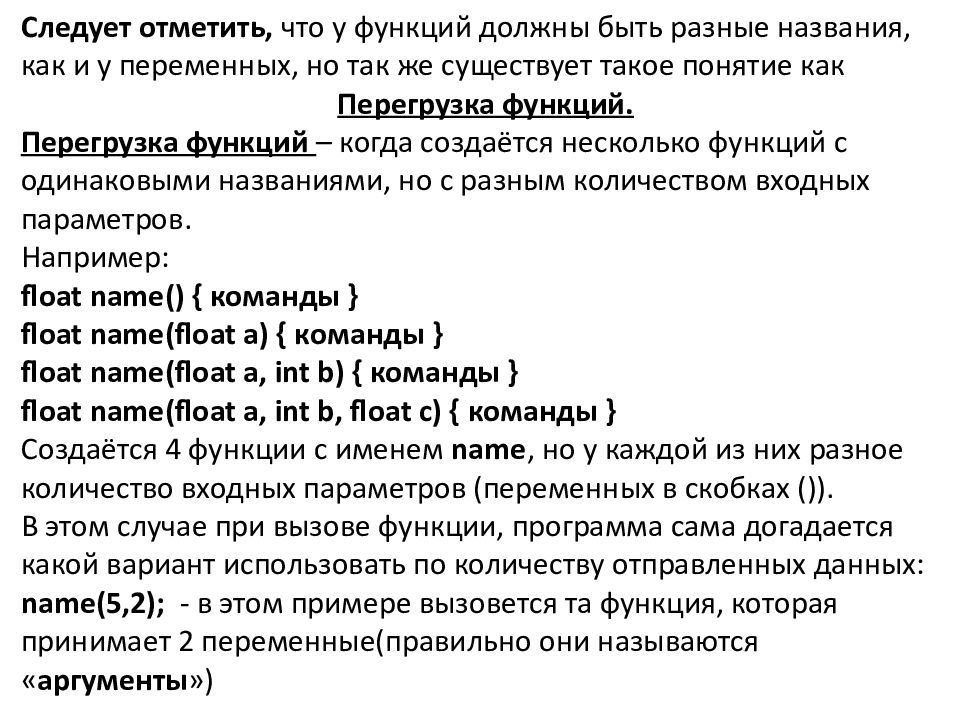 Следует отметить, что у функций должны быть разные названия, как и у переменных, но так же существует такое понятие как Перегрузка функций. Перегрузка функций – когда создаётся несколько функций с одинаковыми названиями, но с разным количеством входных параметров. Например: float name () { команды } float name(float a) { команды } float name(float a, int b) { команды } float name(float a, int b, float c) { команды } Создаётся 4 функции с именем name, но у каждой из них разное количество входных параметров (переменных в скобках ()). В этом случае при вызове функции, программа сама догадается какой вариант использовать по количеству отправленных данных: name(5,2); - в этом примере вызовется та функция, которая принимает 2 переменные(правильно они называются « аргументы »)