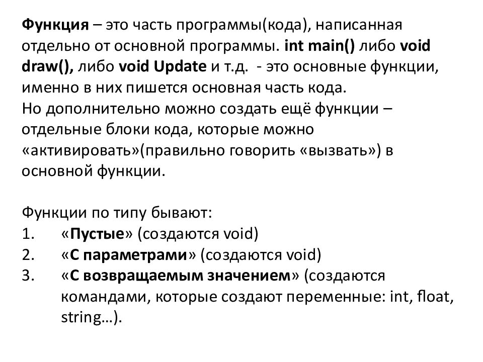 Функция – это часть программы(кода), написанная отдельно от основной программы. int main() либо void draw(), либо void Update и т.д. - это основные функции, именно в них пишется основная часть кода. Но дополнительно можно создать ещё функции – отдельные блоки кода, которые можно «активировать»(правильно говорить «вызвать») в основной функции. Функции по типу бывают : « Пустые » (создаются void ) « С параметрами » ( создаются void ) « С возвращаемым значением » (создаются командами, которые создают переменные: int, float, string… ).