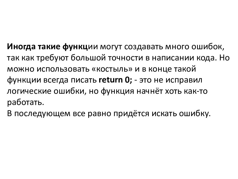 Иногда такие функц ии могут создавать много ошибок, так как требуют большой точности в написании кода. Но можно использовать «костыль» и в конце такой функции всегда писать return 0; - это не исправил логические ошибки, но функция начнёт хоть как-то работать. В последующем все равно придётся искать ошибку.