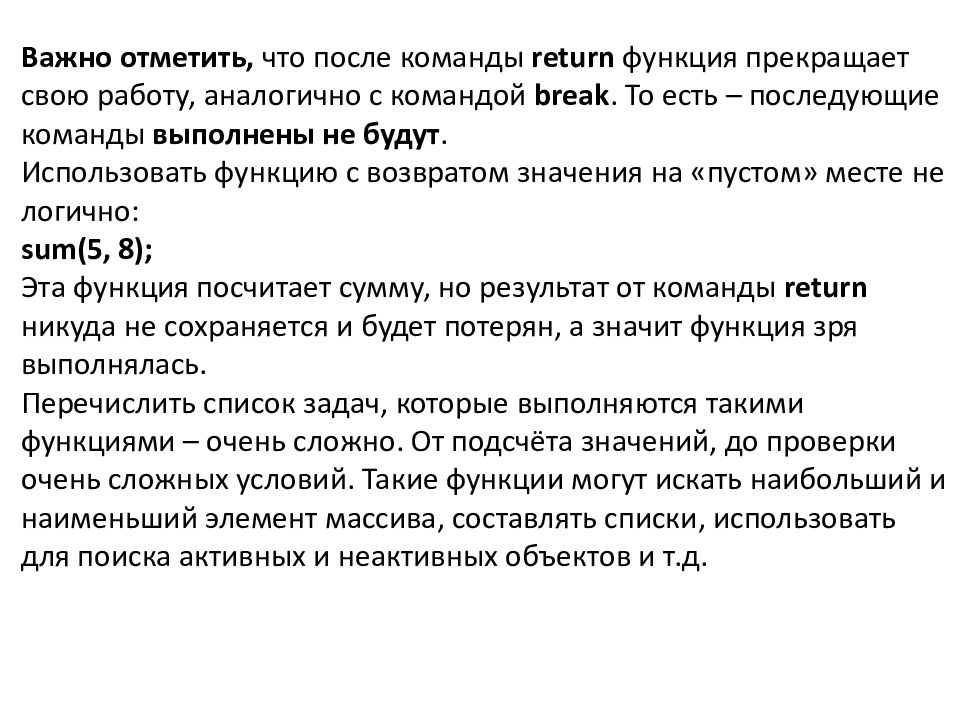 Важно отметить, что после команды return функция прекращает свою работу, аналогично с командой break. То есть – последующие команды выполнены не будут. Использовать функцию с возвратом значения на «пустом» месте не логично: sum(5, 8); Эта функция посчитает сумму, но результат от команды return никуда не сохраняется и будет потерян, а значит функция зря выполнялась. Перечислить список задач, которые выполняются такими функциями – очень сложно. От подсчёта значений, до проверки очень сложных условий. Такие функции могут искать наибольший и наименьший элемент массива, составлять списки, использовать для поиска активных и неактивных объектов и т.д.