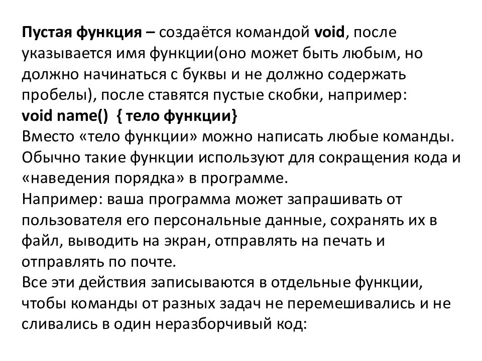 Пустая функция – создаётся командой void, после указывается имя функции ( оно может быть любым, но должно начинаться с буквы и не должно содержать пробелы ), после ставятся пустые скобки, например: void name() { тело функции } Вместо «тело функции» можно написать любые команды. Обычно такие функции используют для сокращения кода и «наведения порядка» в программе. Например: ваша программа может запрашивать от пользователя его персональные данные, сохранять их в файл, выводить на экран, отправлять на печать и отправлять по почте. Все эти действия записываются в отдельные функции, чтобы команды от разных задач не перемешивались и не сливались в один неразборчивый код: