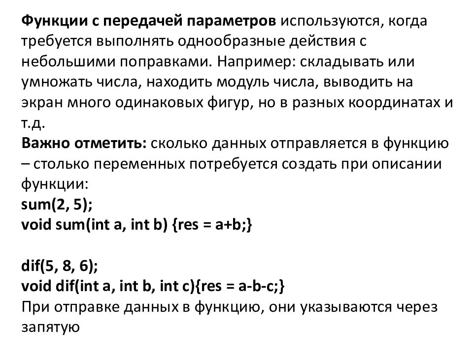 Функции с передачей параметров используются, когда требуется выполнять однообразные действия с небольшими поправками. Например: складывать или умножать числа, находить модуль числа, выводить на экран много одинаковых фигур, но в разных координатах и т.д. Важно отметить: сколько данных отправляется в функцию – столько переменных потребуется создать при описании функции: sum(2, 5); void sum(int a, int b) {res = a+b ;} dif (5, 8, 6); void dif (int a, int b, int c){res = a-b-c;} При отправке данных в функцию, они указываются через запятую
