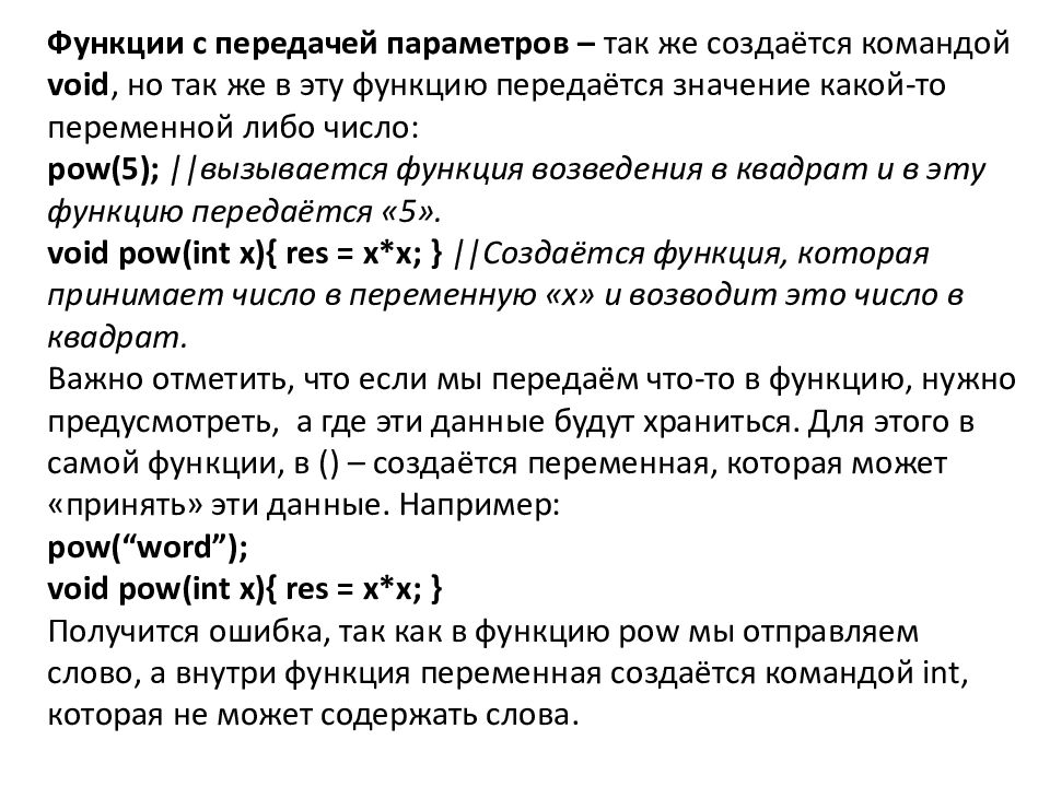 Функции с передачей параметров – так же создаётся командой void, но так же в эту функцию передаётся значение какой-то переменной либо число: pow(5); || вызывается функция возведения в квадрат и в эту функцию передаётся «5». void pow(int x){ res = x*x; } || Создаётся функция, которая принимает число в переменную «х» и возводит это число в квадрат. Важно отметить, что если мы передаём что-то в функцию, нужно предусмотреть, а где эти данные будут храниться. Для этого в самой функции, в () – создаётся переменная, которая может «принять» эти данные. Например: pow(“word”); void pow(int x){ res = x*x; } Получится ошибка, так как в функцию pow мы отправляем слово, а внутри функция переменная создаётся командой int, которая не может содержать слова.