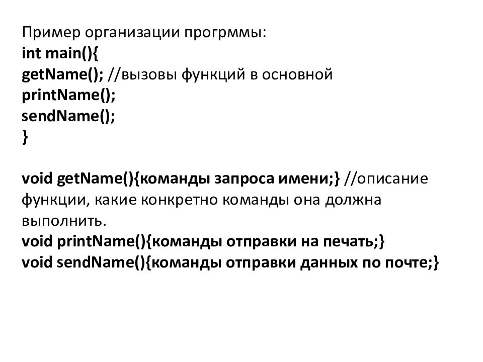 Пример организации прогрммы : int main(){ getName (); //вызовы функций в основной printName (); sendName (); } void getName (){ команды запроса имени; } //описание функции, какие конкретно команды она должна выполнить. void printName (){ команды отправки на печать; } void sendName (){ команды отправки данных по почте; }