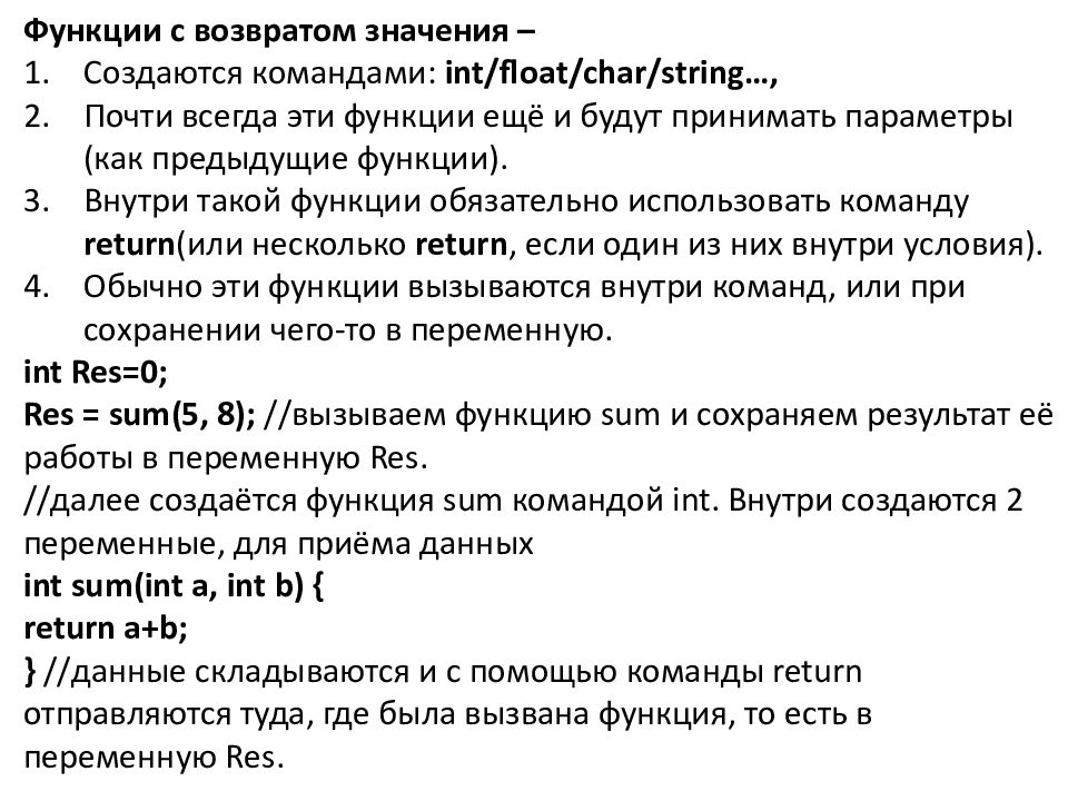 Функции с возвратом значения – Создаются командами: int/float/char/string …, Почти всегда эти функции ещё и будут принимать параметры (как предыдущие функции). Внутри такой функции обязательно использовать команду return (или несколько return, если один из них внутри условия). Обычно эти функции вызываются внутри команд, или при сохранении чего-то в переменную. int Res=0; Res = sum(5, 8); //вызываем функцию sum и сохраняем результат её работы в переменную Res. //далее создаётся функция sum командой int. Внутри создаются 2 переменные, для приёма данных int sum(int a, int b) { return a+b ; } //данные складываются и с помощью команды return отправляются туда, где была вызвана функция, то есть в переменную Res.