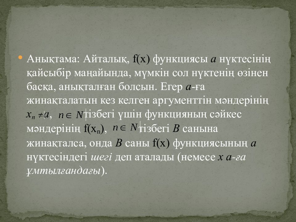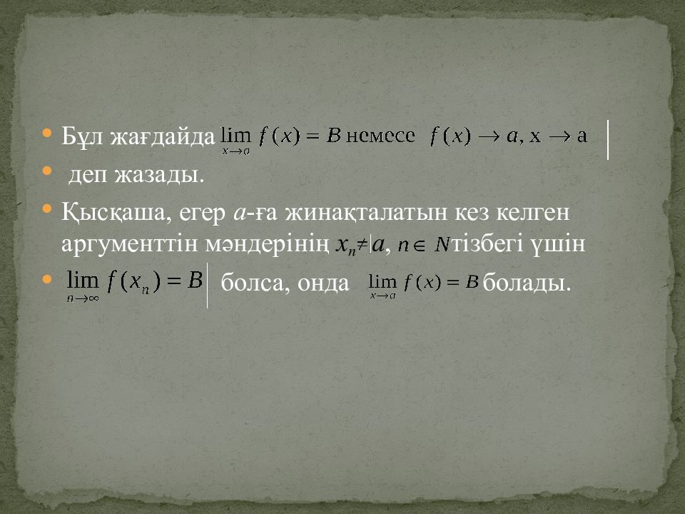 Анықтама: Айталық, f(x) функциясы а нүктесінің қайсыбір маңайында, мүмкін сол нүктенің өзінен басқа, анықталған болсын. Егер а -ға жинақталатын кез келген аргументтін мәндерінің х n а, тізбегі үшін функцияның сәйкес мәндерінің f( x n ), тізбегі В санына жинақталса, онда В саны f(x) функциясының а нүктесіндегі шегі деп аталады ( немесе х а -ға ұмтылғандағы ).