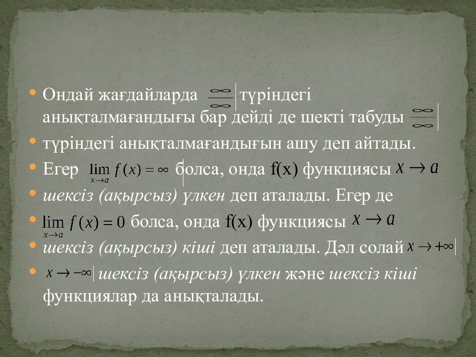 Ондай жағдайларда түріндегі анықталмағандығы бар дейді де шекті табуды түріндегі анықталмағандығын ашу деп айтады. Егер болса, онда f(x) функциясы шексіз (ақырсыз ) үлкен деп аталады. Егер де болса, онда f(x) функциясы шексіз (ақырсыз ) кіші деп аталады. Дәл солай шексіз (ақырсыз ) үлкен және шексіз кіші функциялар да анықталады.