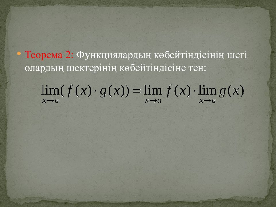 Теорема 2: Функциялардың көбейтіндісінің шегі олардың шектерінің көбейтіндісіне тең: