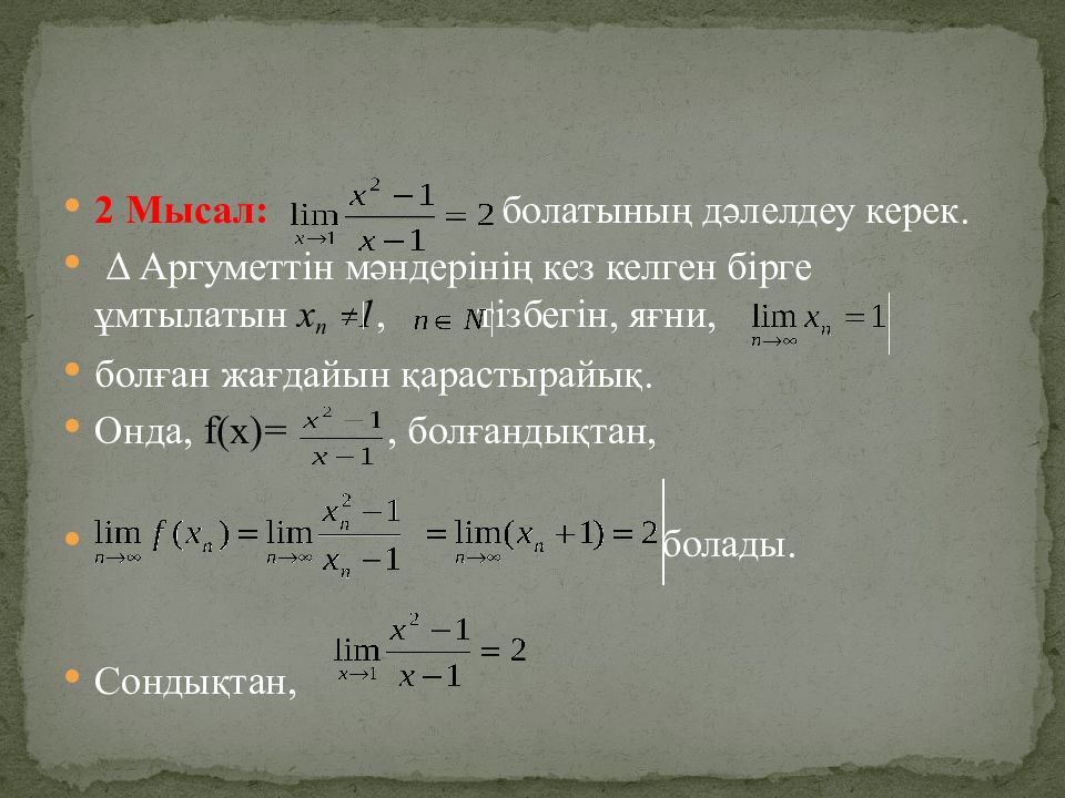 2 Мысал : болатының дәлелдеу керек. Δ Аргуметтін мәндерінің кез келген бірге ұмтылатын х n 1, тізбегін, яғни, болған жағдайын қарастырайық. Онда, f(x)=, болғандықтан, болады. Сондықтан,