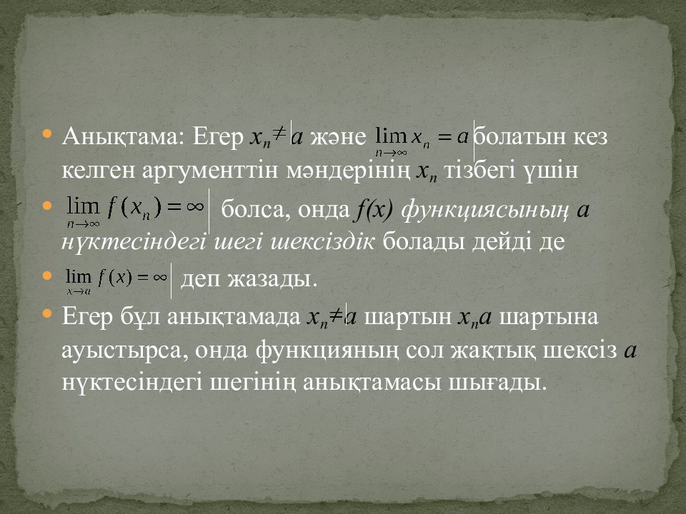 Анықтама: Егер х n а және болатын кез келген аргументтін мәндерінің х n тізбегі үшін болса, онда f(x) функциясының а нүктесіндегі шегі шексіздік болады дейді де деп жазады. Егер бұл анықтамада х n а шартын х n а шартына ауыстырса, онда функцияның сол жақтық шексіз а нүктесіндегі шегінің анықтамасы шығады.