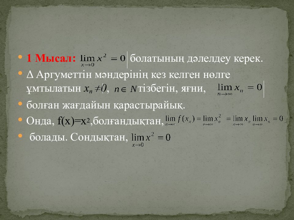 1 Мысал : болатының дәлелдеу керек. Δ Аргуметтін мәндерінің кез келген нөлге ұмтылатын х n 0, тізбегін, яғни, болған жағдайын қарастырайық. Онда, f(x)=x 2, болғандықтан, болады. Сондықтан,