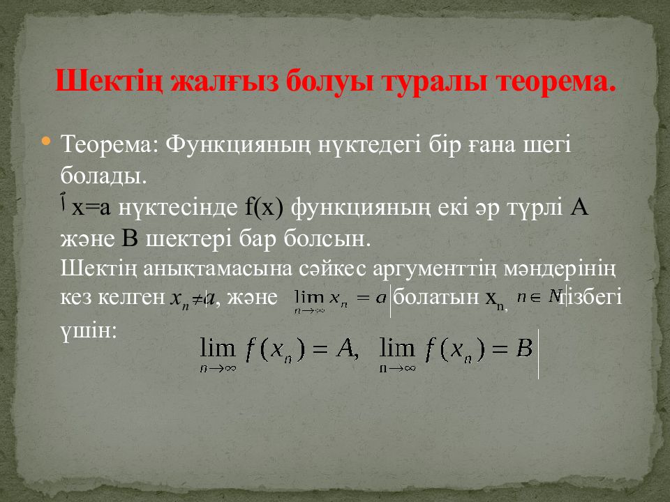Слайд 6: Шектің жалғыз болуы туралы теорема