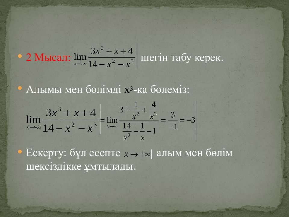 2 Мысал : шегін табу керек. Алымы мен бөлімді х 3 -қа бөлеміз : Ескерту : бұл есепте алым мен бөлім шексіздікке ұмтылады.