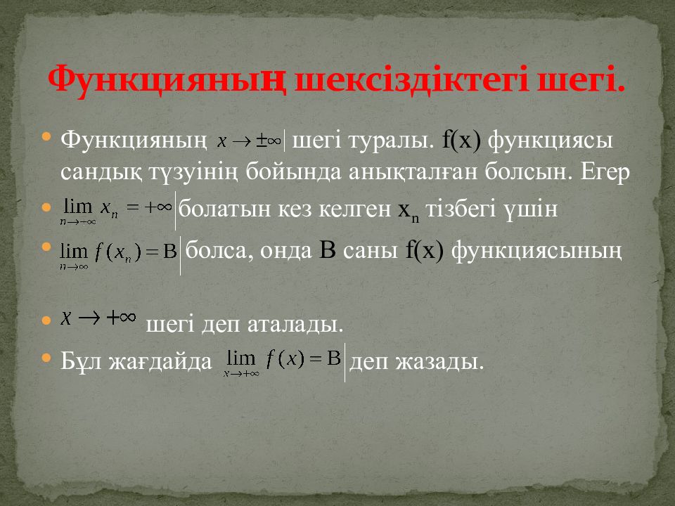 Функцияның шегі туралы. f(x) функциясы сандық түзуінің бойында анықталған болсын. Егер болатын кез келген х n тізбегі үшін болса, онда В саны f ( x ) функциясының шегі деп аталады. Бұл жағдайда деп жазады. Функцияның шексіздіктегі шегі.