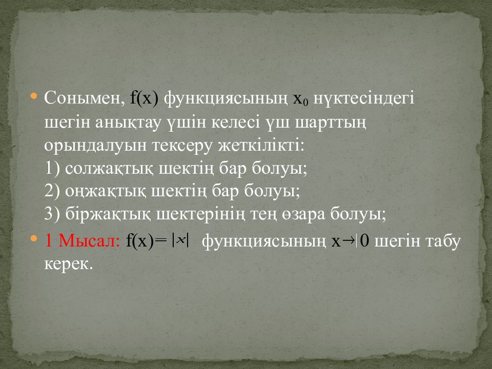 Сонымен, f(x) функциясының х 0 нүктесіндегі шегін анықтау үшін келесі үш шарттың орындалуын тексеру жеткілікті : 1) солжақтық шектің бар болуы ; 2) оңжақтық шектің бар болуы ; 3) біржақтық шектерінің тең өзара болуы ; 1 Мысал : f(x) функциясының х 0 шегін табу керек.