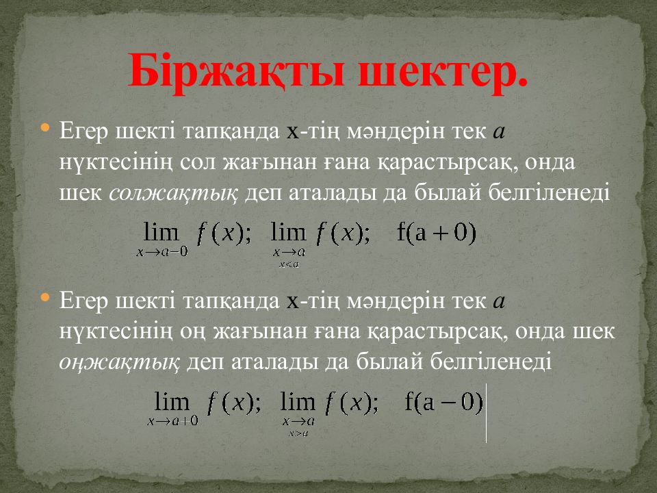 Егер шекті тапқанда х -тің мәндерін тек а нүктесінің сол жағынан ғана қарастырсақ, онда шек солжақтық деп аталады да былай белгіленеді Егер шекті тапқанда х -тің мәндерін тек а нүктесінің оң жағынан ғана қарастырсақ, онда шек оңжақтық деп аталады да былай белгіленеді Біржақты шектер.