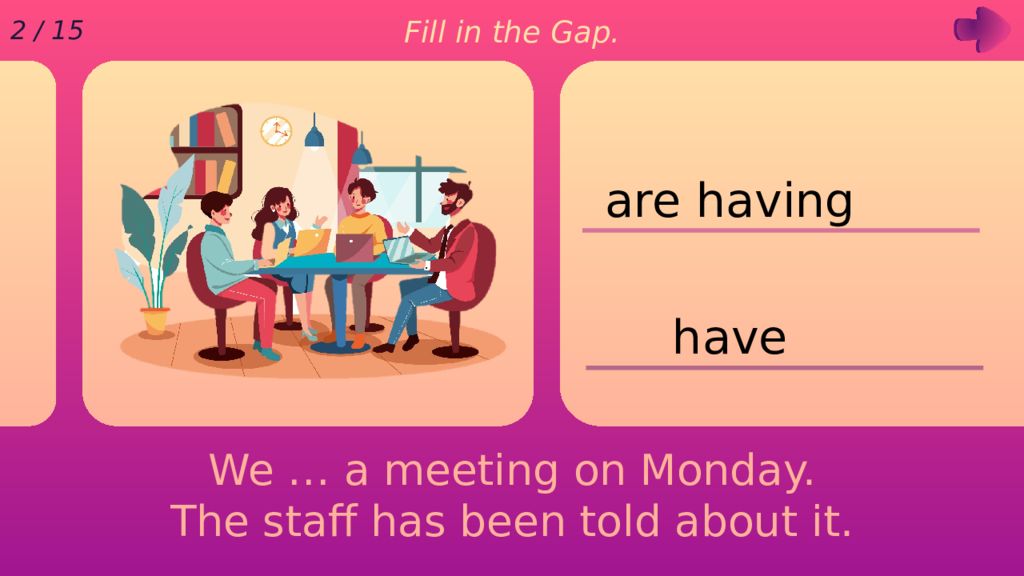 Fill in the Gap. 2 / 15 are having have We … a meeting on Monday. The staff has been told about it.