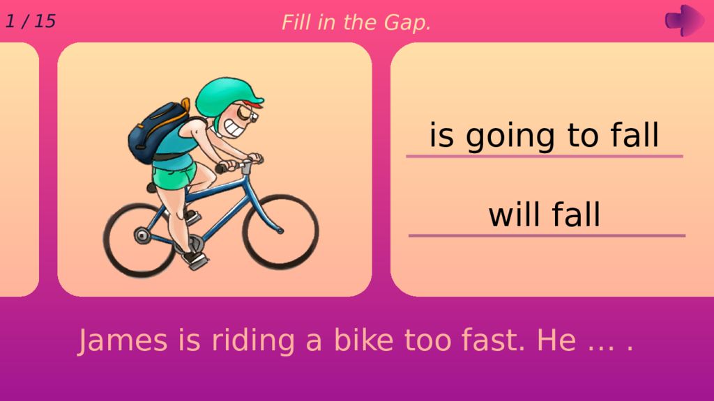 Fill in the Gap. 1 / 15 is going to fall will fall James is riding a bike too fast. He ….