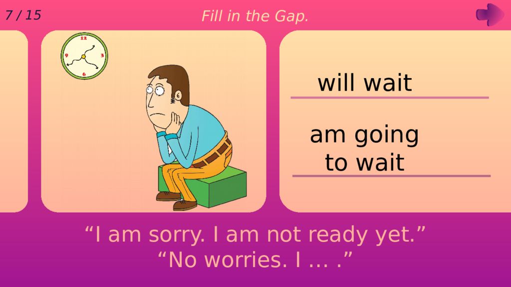 Fill in the Gap. 7 / 15 will wait am going to wait “I am sorry. I am not ready yet.” “No worries. I ….”