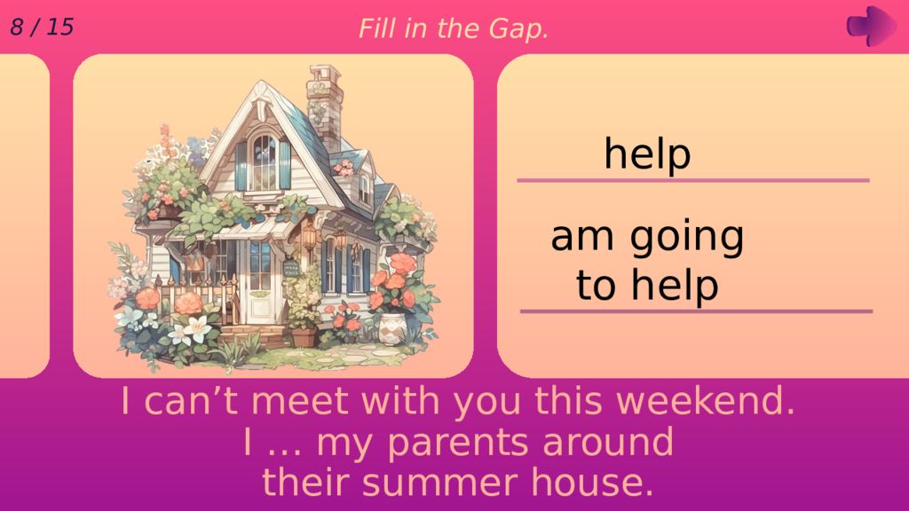 Fill in the Gap. 8 / 15 help am going to help I can’t meet with you this weekend. I … my parents around their summer house.