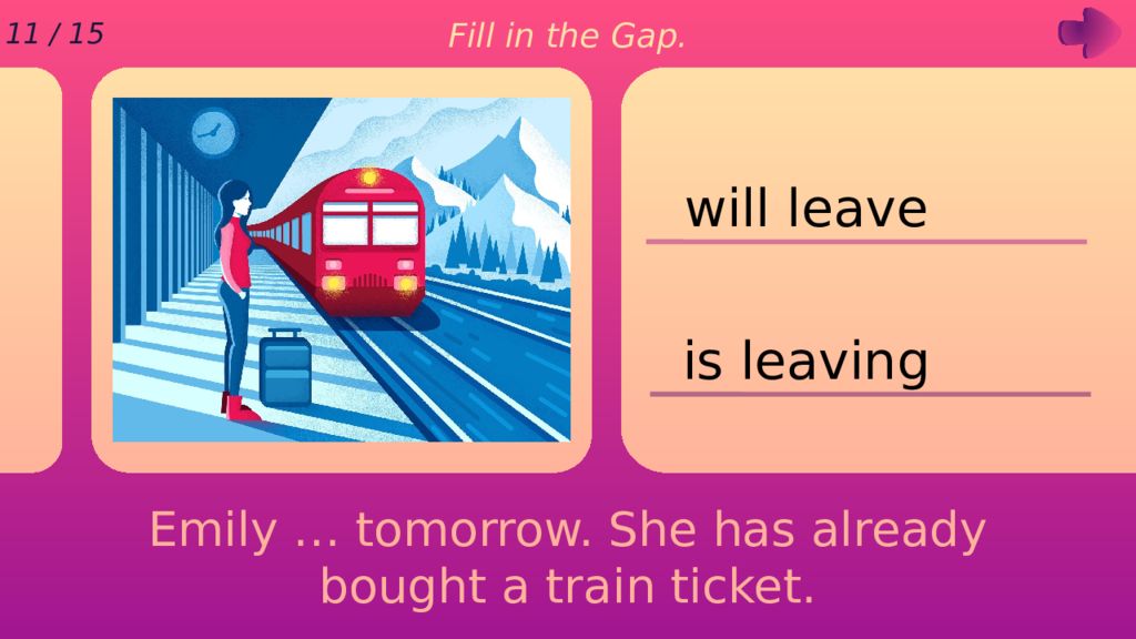Fill in the Gap. 11 / 15 will leave is leaving Emily … tomorrow. She has already bought a train ticket.