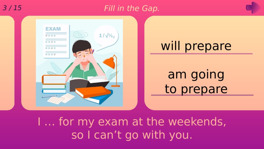 Fill in the Gap. 3 / 15 will prepare am going to prepare I … for my exam at the weekends, so I can’t go with you.