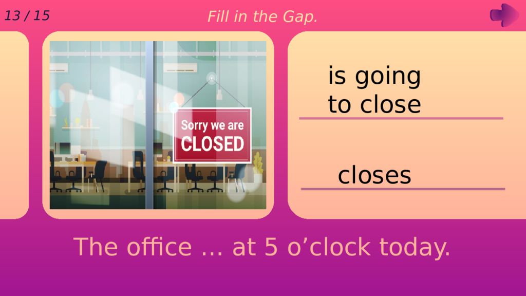 Fill in the Gap. 13 / 15 is going to close closes The office … at 5 o’clock today.