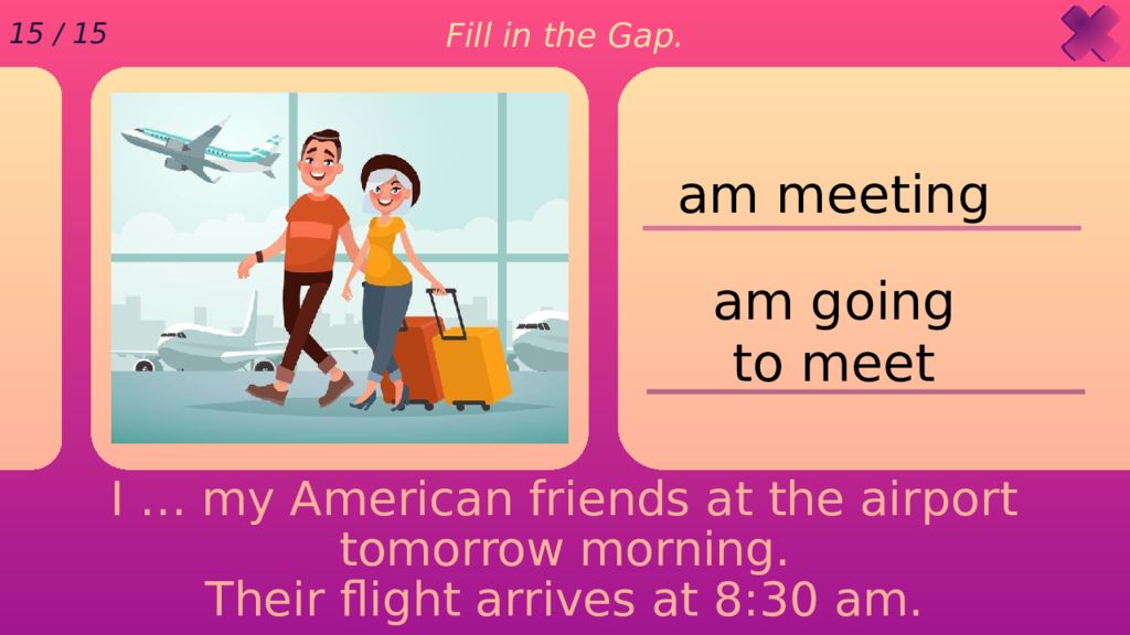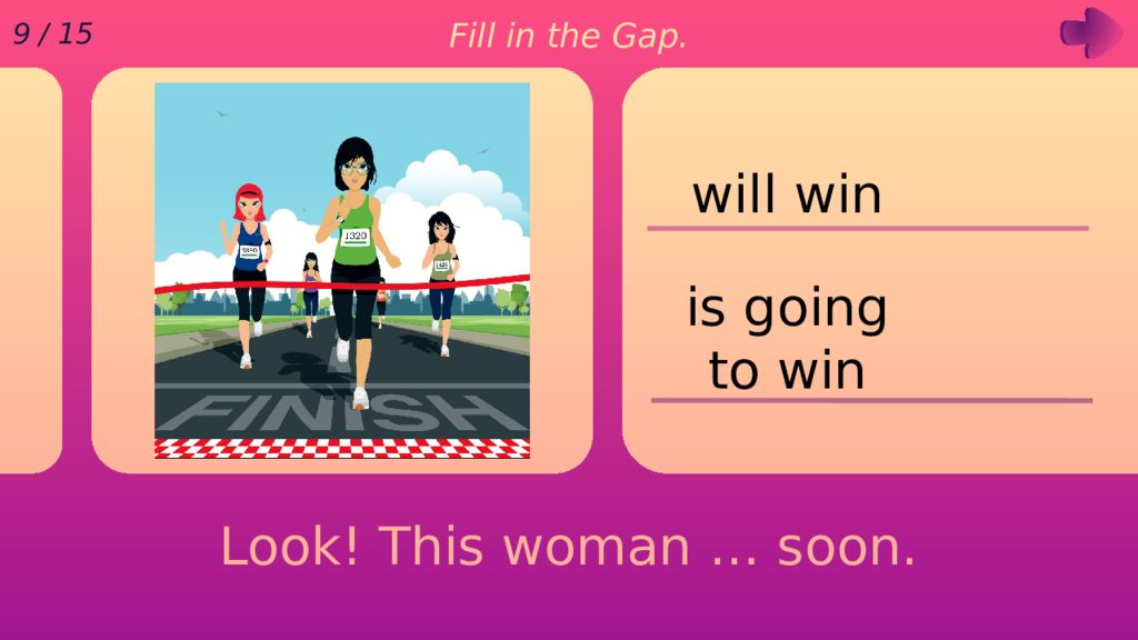 Fill in the Gap. 9 / 15 will win is going to win Look! This woman … soon.