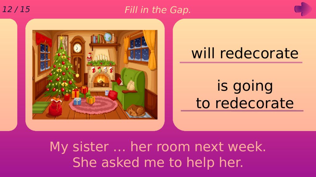 Fill in the Gap. 12 / 15 will redecorate is going to redecorate My sister … her room next week. She asked me to help her.