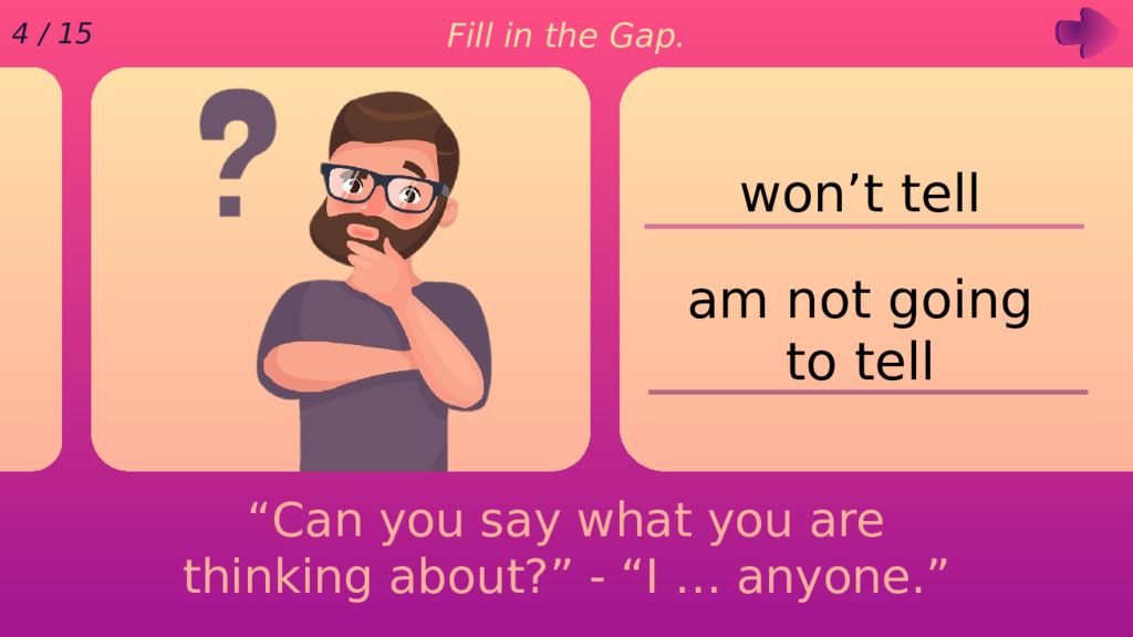 Fill in the Gap. 4 / 15 won’t tell am not going to tell “Can you say what you are thinking about ?” - “ I … anyone.”
