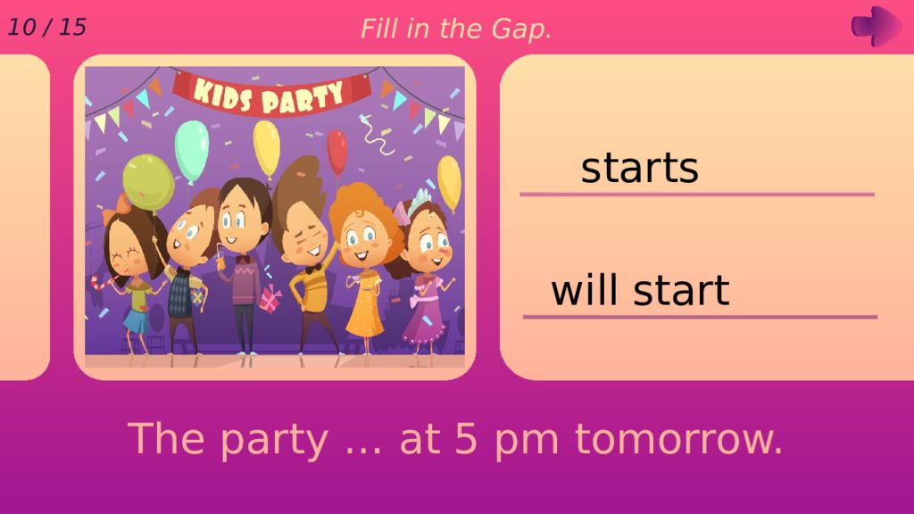 Fill in the Gap. 10 / 15 starts will start The party … at 5 pm tomorrow.