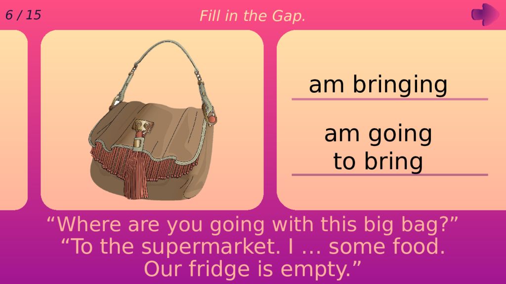 Fill in the Gap. 6 / 15 am bringing am going to bring “Where are you going with this big bag?” “To the supermarket. I … some food. Our fridge is empty.”