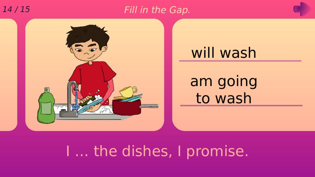 Fill in the Gap. 14 / 15 will wash am going to wash I … the dishes, I promise.