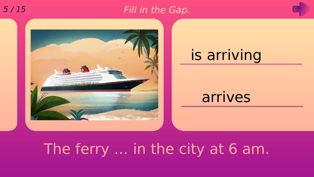 Fill in the Gap. 5 / 15 is arriving arrives The ferry … in the city at 6 am.
