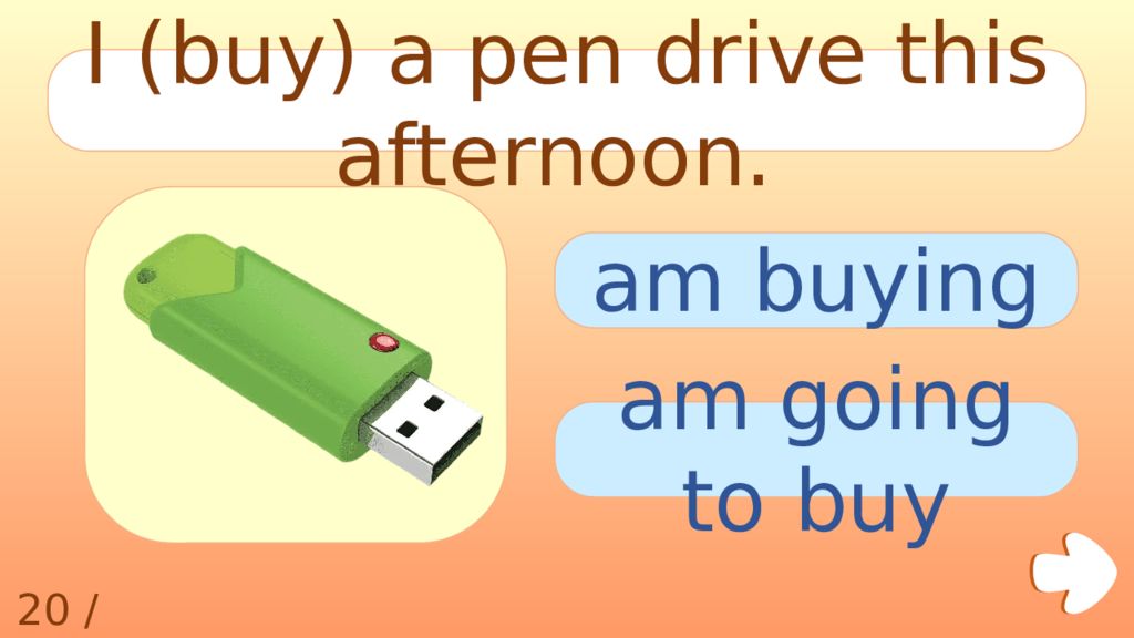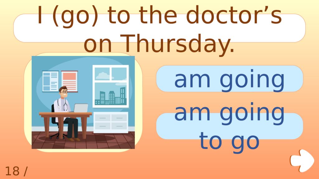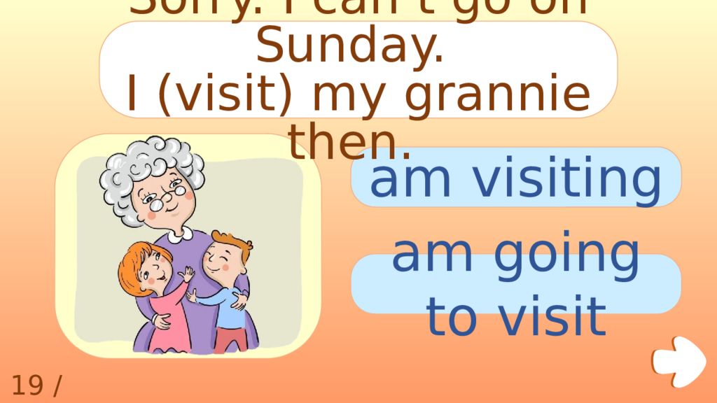 am visiting a m going to visit Sorry. I can ’ t go on Sunday. I (visit) my grannie then. 19 / 22