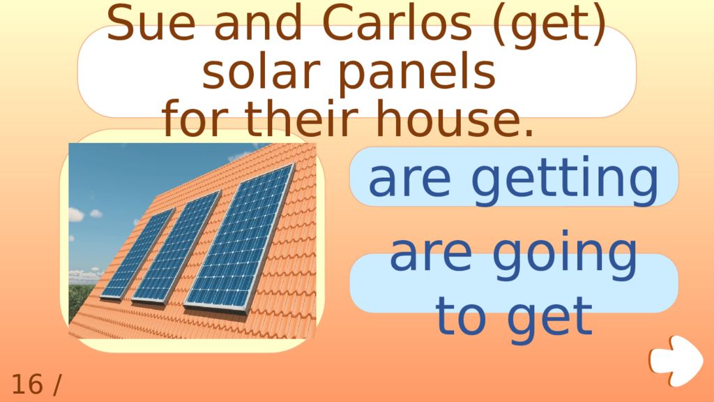 are getting are going to get Sue and Carlos (get) solar panels for their house. 16 / 22