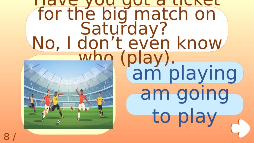 am playing a m going to play Have you got a ticket for the big match on Saturday? No, I don ’ t even know who (play). 8 / 22