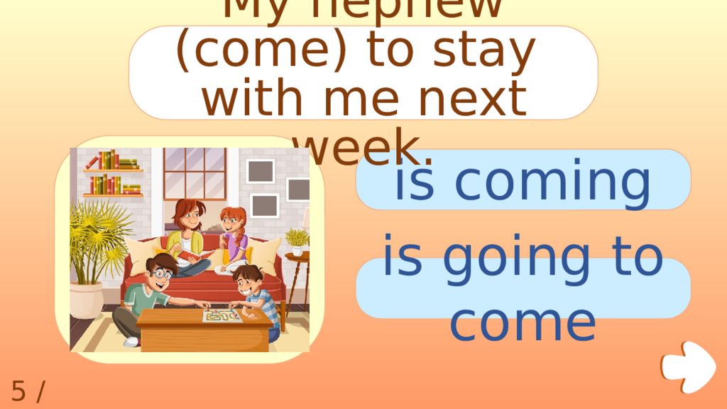 is coming is going to come My nephew (come) to stay with me next week. 5 / 22