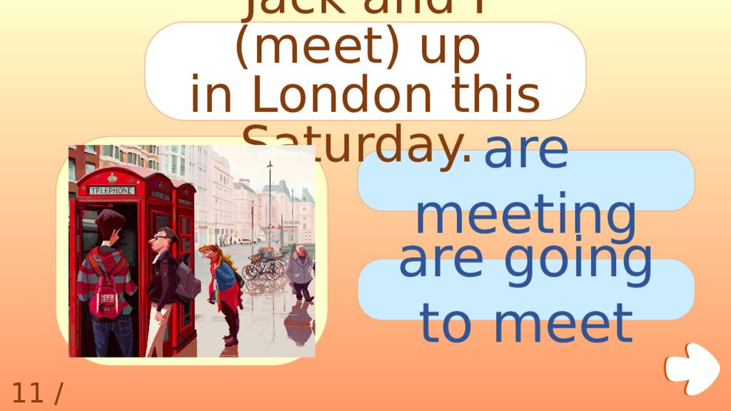 are meeting are going to meet Jack and I (meet) up in London this Saturday. 11 / 22
