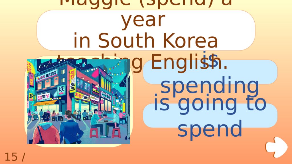 is spending is going to spend Maggie (spend) a year in South Korea teaching English. 15 / 22