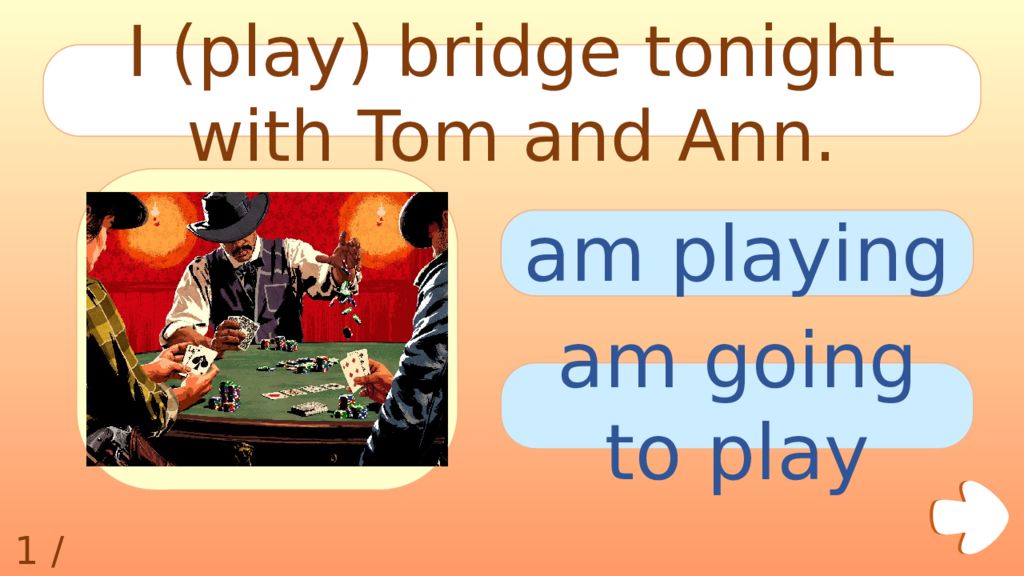 am playing a m going to play I (play) bridge tonight with Tom and Ann. 1 / 22