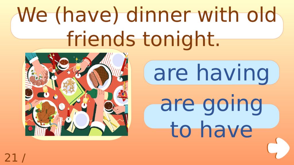are having are going to have We (have) dinner with old friends tonight. 21 / 22