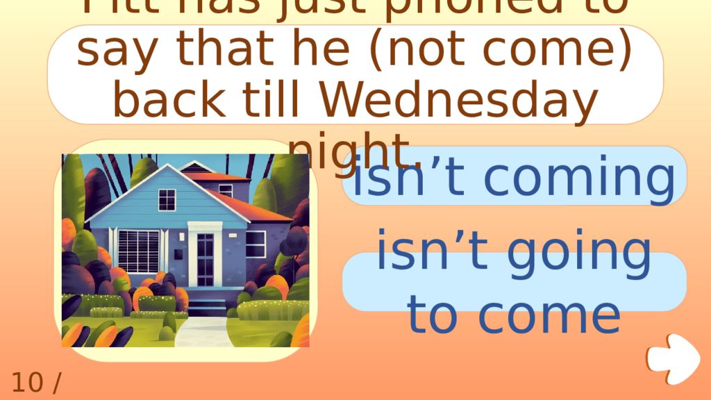 isn ’ t coming isn ’ t going to come Pitt has just phoned to say that he (not come) back till Wednesday night. 10 / 22