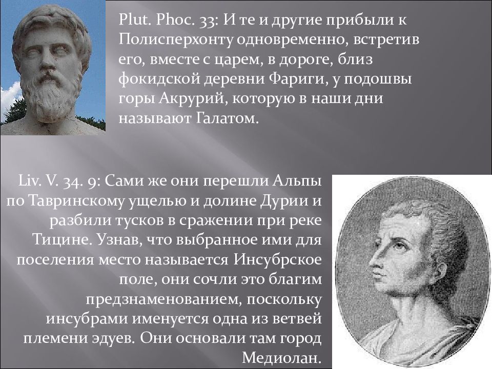 Liv. V. 34. 9: Сами же они перешли Альпы по Тавринскому ущелью и долине Дурии и разбили тусков в сражении при реке Тицине. Узнав, что выбранное ими для поселения место называется Инсубрское поле, они сочли это благим предзнаменованием, поскольку инсубрами именуется одна из ветвей племени эдуев. Они основали там город Медиолан. Plut. Phoc. 33: И те и другие прибыли к Полисперхонту одновременно, встретив его, вместе с царем, в дороге, близ фокидской деревни Фариги, у подошвы горы Акрурий, которую в наши дни называют Галатом.