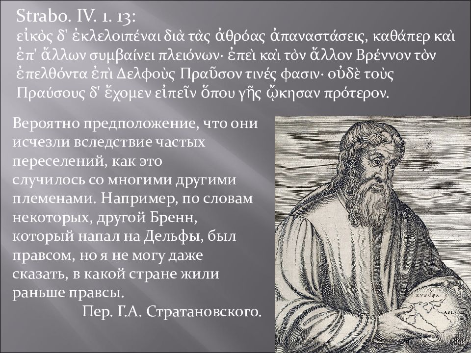 Strabo. IV. 1. 13: εἰκὸς δ' ἐκλελοιπέναι διὰ τὰς ἀθρόας ἀπαναστάσεις, καθάπερ καὶ ἐπ' ἄλλων συμβαίνει πλειόνων· ἐπεὶ καὶ τὸν ἄλλον Βρέννον τὸν ἐπελθόντα ἐπὶ Δελφοὺς Πραῦσον τινές φασιν · οὐδὲ τοὺς Πραύσους δ ' ἔχομεν εἰπεῖν ὅπου γῆς ᾤκησαν πρότερον. Вероятно предположение, что они исчезли вследствие частых переселений, как это случилось со многими другими племенами. Например, по словам некоторых, другой Бренн, который напал на Дельфы, был правсом, но я не могу даже сказать, в какой стране жили раньше правсы. Пер. Г.А. Стратановского.