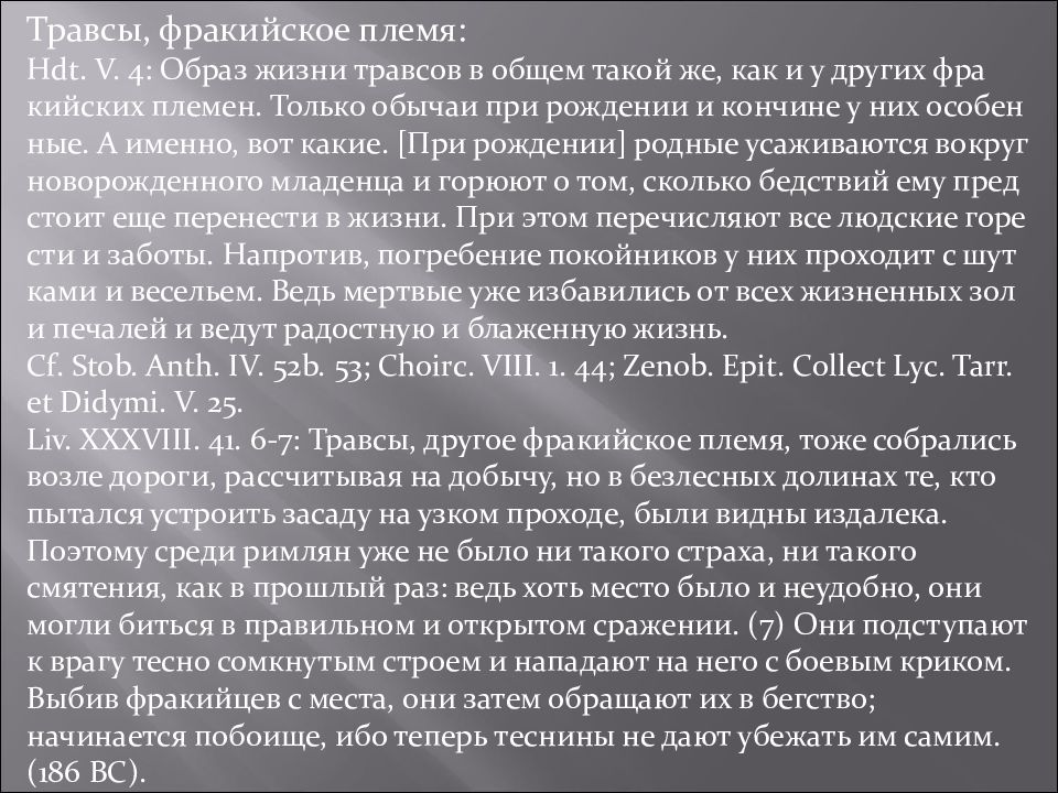 Травсы, фракийское племя : Hdt. V. 4: Образ жизни травсов в общем такой же, как и у других фракийских племен. Только обычаи при рождении и кончине у них особенные. А именно, вот какие. [При рождении] родные усаживаются вокруг новорожденного младенца и горюют о том, сколько бедствий ему предстоит еще перенести в жизни. При этом перечисляют все людские горести и заботы. Напротив, погребение покойников у них проходит с шутками и весельем. Ведь мертвые уже избавились от всех жизненных зол и печалей и ведут радостную и блаженную жизнь. Cf. Stob. Anth. IV. 52b. 53; Choirc. VIII. 1. 44; Zenob. Epit. Collect Lyc. Tarr. et Didymi. V. 25. Liv. XXXVIII. 41. 6‑7: Травсы, другое фракийское племя, тоже собрались возле дороги, рассчитывая на добычу, но в безлесных долинах те, кто пытался устроить засаду на узком проходе, были видны издалека. Поэтому среди римлян уже не было ни такого страха, ни такого смятения, как в прошлый раз: ведь хоть место было и неудобно, они могли биться в правильном и открытом сражении. (7) Они подступают к врагу тесно сомкнутым строем и нападают на него с боевым криком. Выбив фракийцев с места, они затем обращают их в бегство; начинается побоище, ибо теперь теснины не дают убежать им самим. (186 BC).