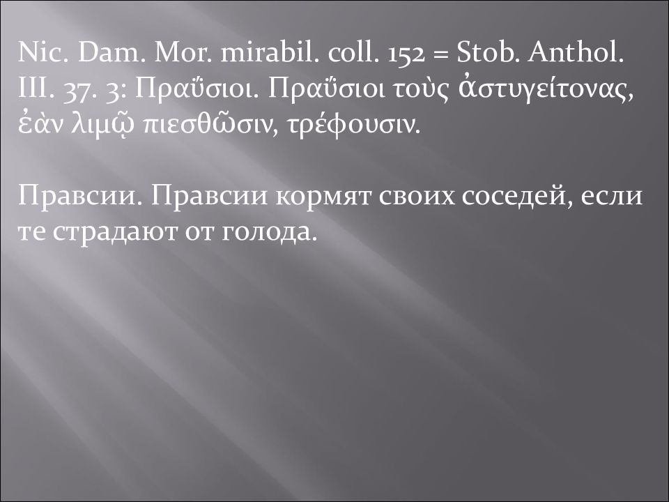 Nic. Dam. Mor. mirabil. coll. 152 = Stob. Anthol. III. 37. 3: Πραΰσιοι. Πραΰσιοι τοὺς ἀστυγείτονας, ἐὰν λιμῷ πιεσθῶσιν, τρέ φουσιν. Правсии. Правсии кормят своих соседей, если те страдают от голода.