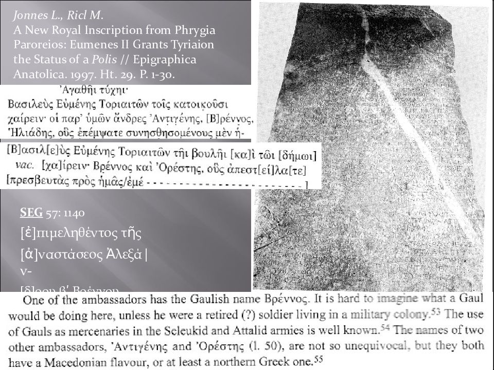Jonnes L., Ricl M. A New Royal Inscription from Phrygia Paroreios: Eumenes II Grants Tyriaion the Status of a Polis // Epigraphica Anatolica. 1997. Ht. 29. P. 1-30. SEG 57: 1140 [ἐ]πιμεληθέντος τῆς [ἀ]ναστάσεος Ἀλεξά|ν- [δ]ρου βʹ Βρέννου.