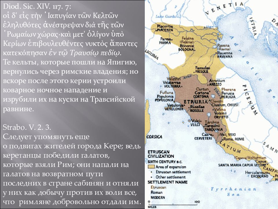 Diod. Sic. XIV. 117. 7: οἱ δ ' εἰς τὴν ᾿Ιαπυγίαν τῶν Κελτῶν ἐληλυθότες ἀνέστρεψαν διὰ τῆς τῶν ῾Ρωμαίων χώρας · καὶ μετ ' ὀλίγον ὑπὸ Κερίων ἐπιβουλευθέντες νυκτὸς ἅπαντες κατεκόπησαν ἐν τῷ Τραυσίῳ πεδίῳ. Те кельты, которые пошли на Япигию, вернулись через римские владения; но вскоре после этого керии устроили коварное ночное нападение и изрубили их на куски на Травсийской равнине. Strabo. V. 2. 3. Следует упомянуть еще о подвигах жителей города Кере; ведь керетанцы победили галатов, которые взяли Рим; они напали на галатов на возвратном пути последних в стране сабинян и отняли у них как добычу против их воли все, что римляне добровольно отдали им.